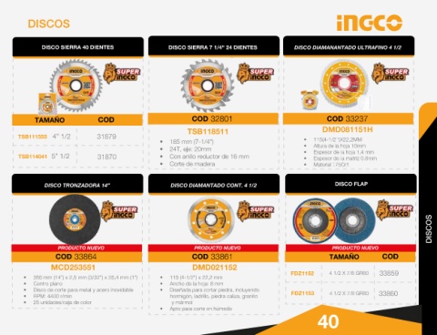 • 355 mm (14") x 2,5 mm (3/32") x 25,4 mm (1") • 115 (4-1/2") x 22,2 mm