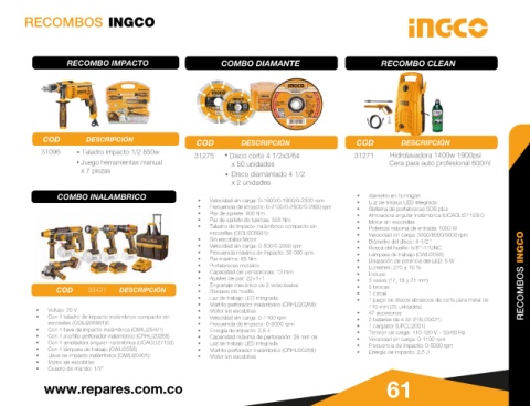 31096 Taladro impacto 1/2 850w 31275 Disco corte 4 1/2x3/64 31271 Hidrolavadora 1400w 1900psi